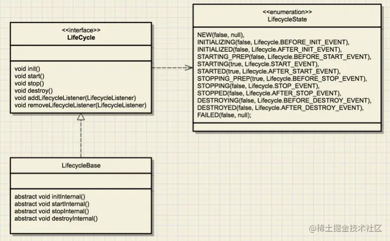 组件的init()和start()调用是由它的父组件的状态变化触发的,上层组件的初始化会触发子组件的初始化,上层组件的启动会触发子组件的启动。因此我们把组件的生命周期定义成一个个状态,把状态的转变看作是一个事件。而事件是有监听器的,在监听器里可以实现一些逻辑,并且监听器也可以方便的添加和删除,这就是典型的观察者模式。