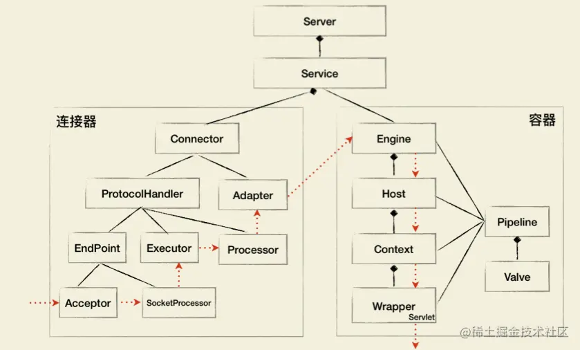 - 组件有外有内,外层组件控制内层组件,比如连接器是外层组件,负责对外交流,外层组件调用内层组件完成业务功能。也就是说,请求的处理过程是由外层组件来驱动的