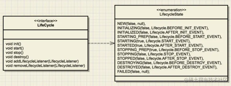 这里我们把LifeCycle接口定义分为两部分,一部分是组件的生命周期方法,比如init()、start()、stop()、destroy()。另一部分是扩展接口就是状态和监听器,关于状态和监听器,我们文章下面再介绍。