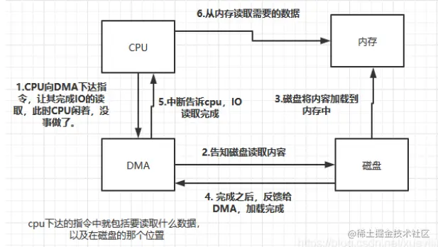 4)以磁盘IO来说,实际上当CPU需要磁盘中某些文件的时候,并不是直接CPU向磁盘IO要数据,而是交给DMA来完成磁盘io的数据读取,执行如下操作:
