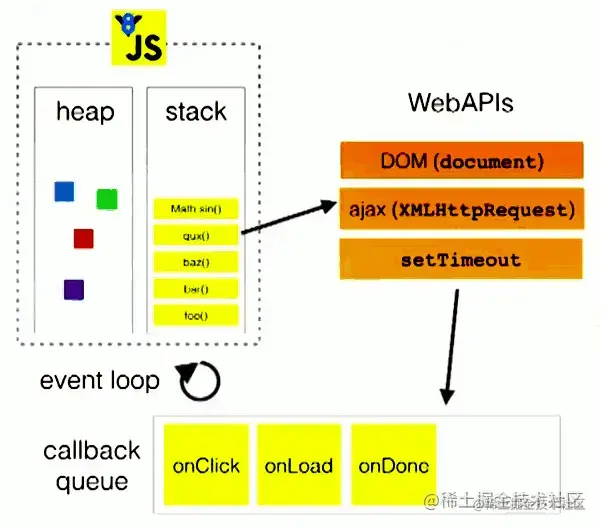 虽然JS是单线程的但是浏览器的内核是多线程的,在浏览器的内核中不同的异步操作由不同的浏览器内核模块调度执行,异步操作会将相关回调添加到任务队列中。而不同的异步操作添加到任务队列的时机也不同,如 onclick, setTimeout, ajax 处理的方式都不同,这些异步操作是由浏览器内核的 webcore 来执行的,webcore 包含上图中的3种 webAPI,分别是 DOM Binding、network、timer模块。