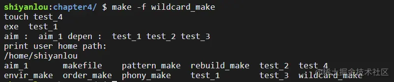 从内容上我们可以知道 wildcard_make 使用 all 作为最终目标,依赖项为 aim_1。 aim_1 规则与 aim_% 相匹配,依赖项为所有的以 test_ 开头的文件。命令执行后将为打印一些信息。 test_ 开头的文件名若为 test_1,则会依赖于 test_4,并打印执行 test_1 目标的信息。 test_4 匹配 test_% 规则,会新建一个 test_4 文件。