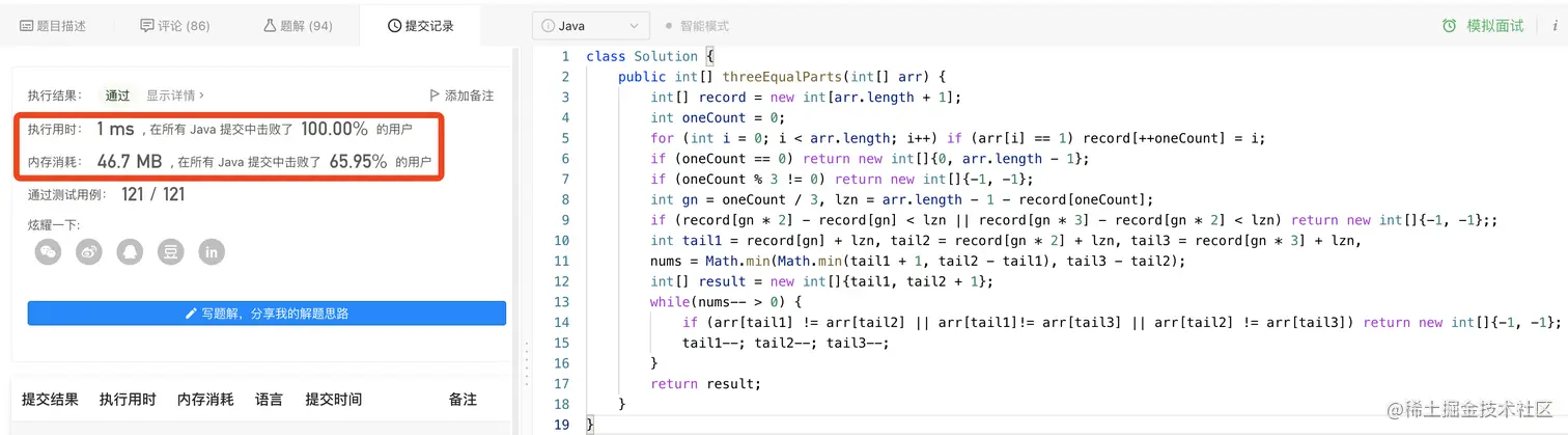 然后,我们以最短分组长度为基准,从末尾开始校验每组中相对应位置的值是否相同,如果都相同,那么就满足了题目中所描述的“三等分”了。然后将[i, j]返回即可。