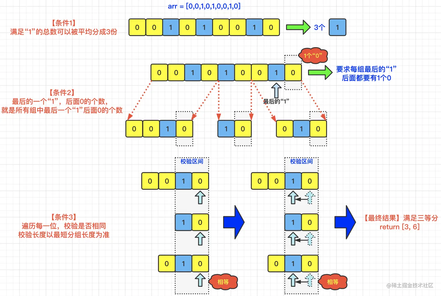 arr[0],arr[1], ...,arr[i]为第一部分;arr[i + 1],arr[i + 2], ...,arr[j - 1]为第二部分;arr[j],arr[j + 1], ...,arr[arr.length - 1]为第三部分;- 这3个部分所表示的二进制值相等;