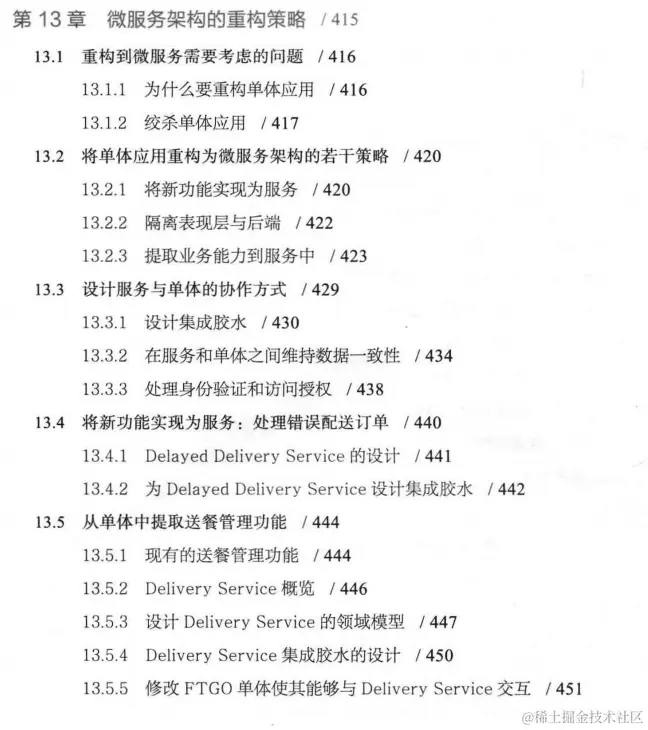 第13章介绍了如何通过采用绞杀者( Strangler)模式逐步将单体架构重构为微服务架构,绞杀者模式是指以服务形式实现新功能,从单体中提取模块将其转换为服务。