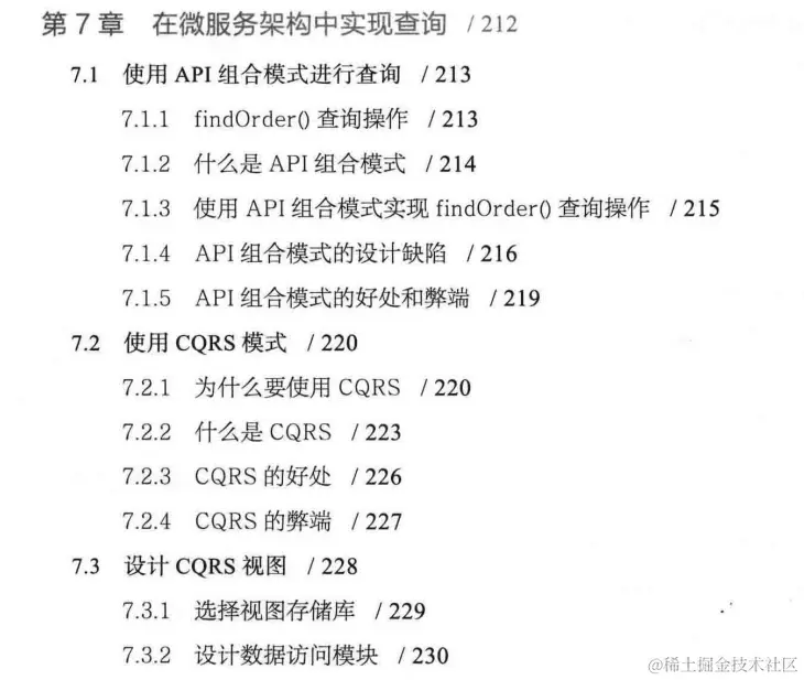 第7章介绍如何使用API组合模式或命令查询职责隔离(CQRS)模式,这两个模式用来实现查询分散在多个服务中的数据。