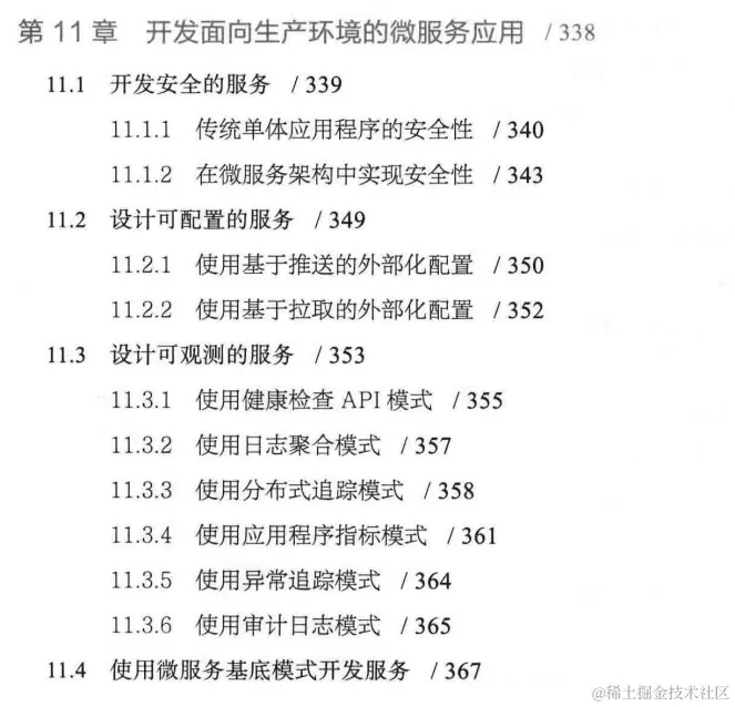 第11章介绍了开发生产就绪服务的各个方面,包括安全性、外部化配置模式和服务可观测性模式。服务可观测性模式包括日志聚合、应用指标和分布式追踪。