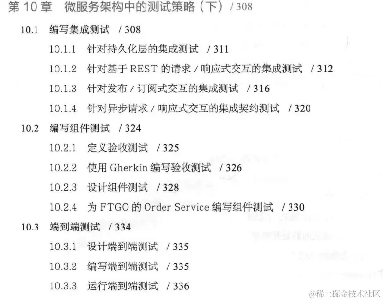 第10章以第9章为基础,描述了如何在测试金字塔中编写其他类型的测试,包括集成测试、消费者契约测试和组件测试等。