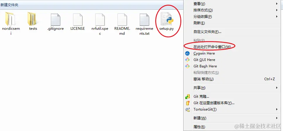 1.把pc-nrfutil解压。打开有setup.py的文件夹,在此处打开dos命令(shift + 鼠标右键)