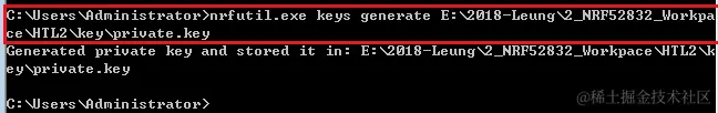 在D盘新建一个文件夹,命名为key,在cmd命令中输入以下内容:nrfutil.exe keys generate D:\key\private.key指令,生成私钥文件private.key