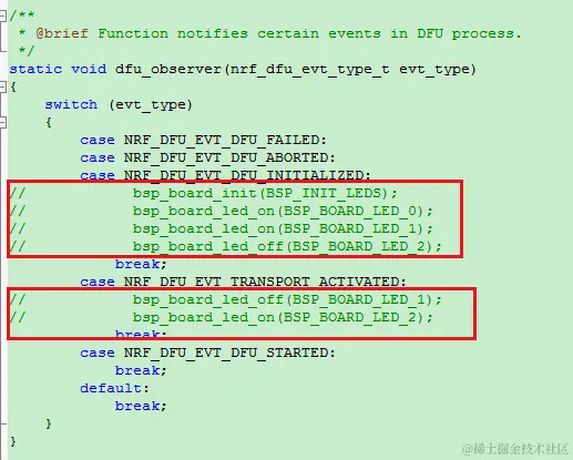 如果LED灯IO口跟secure_bootloader工程默认引脚不同或原来LED引脚用作其他功能,需要将dfu_observer()函数中LED灯相关代码屏蔽,否则会一直运行在bootloader,不跳转到application