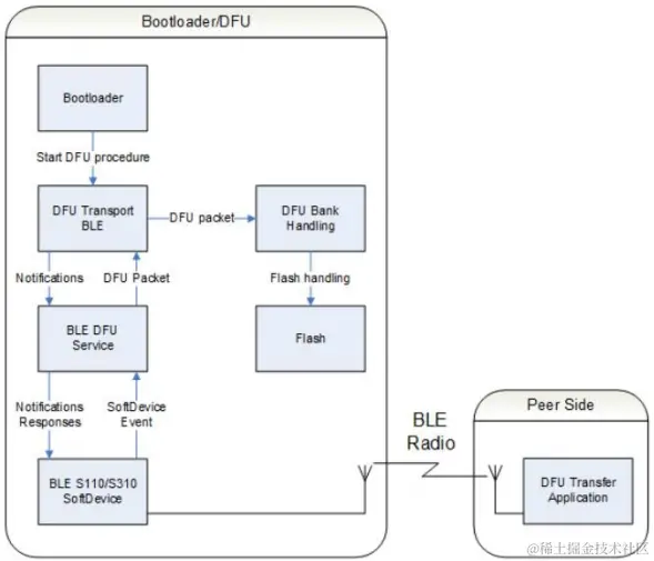 bootloader 是引导加载程序,DFU的基本流程就是在 bootloader中接收新固件数据并写入Flash,接收完毕后重启跳转并运行新固件 。其中SDK v11及更早版本中bootloader为开放透明性的Legacy DFU,而SDK v12之后有了加密性的Secure DFU。