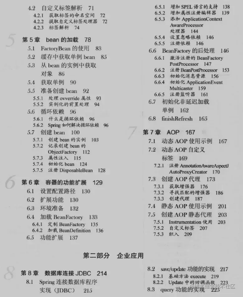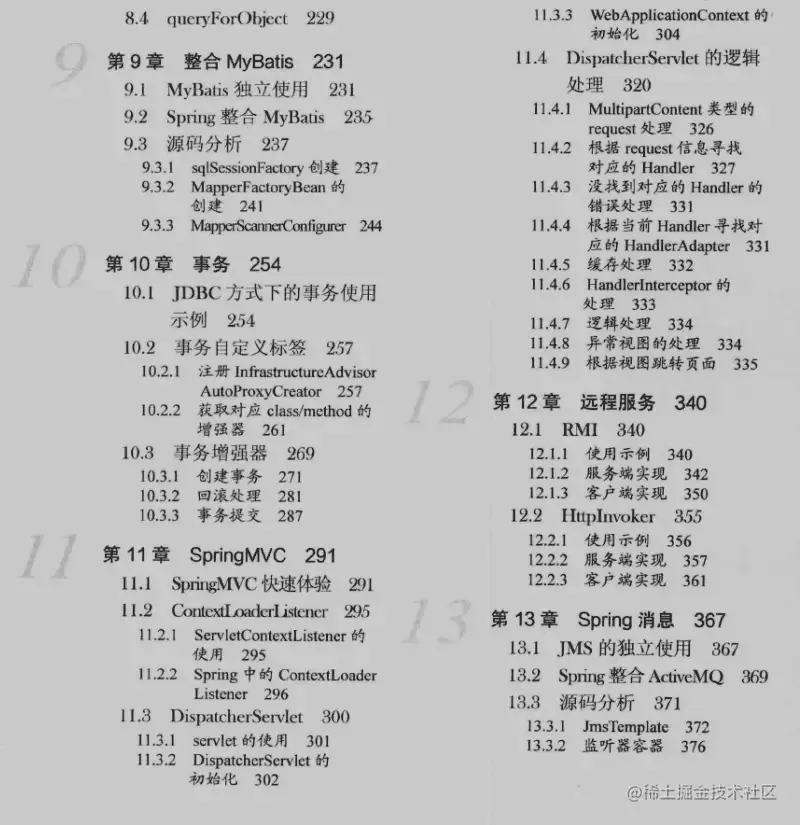 本文档从核心实现和企业应用两个方面,由浅入深、由易到难地对Spring源码展开了系统的讲解,包括Spring 的设计理念和整体架构、容器的基本实现、默认标签的解析、自定义标签的解析、bean的加载、容器的功能扩展、AOP、数据库连接JDBC、整合MyBatis、事务、SpringMVC、远程服务、Spring 消息服务等内容。由于篇幅限制就只展示目录了~