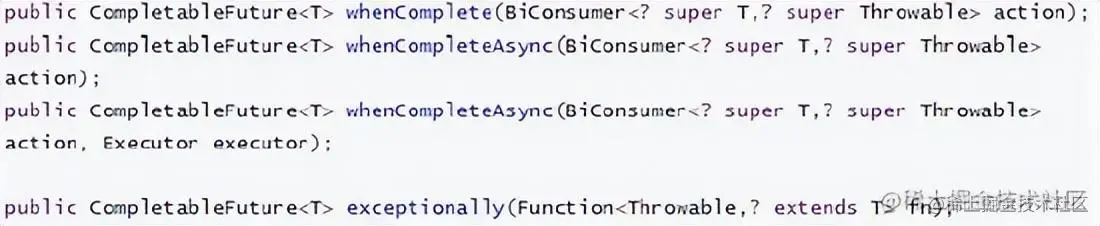 - whenComplete 和whenCompleteAsync 的区别: whenComplete:是执行当前任务的线程执行继续执行whenComplete 的任务。 whenCompleteAsync:是执行把whenCompleteAsync 这个任务继续提交给线程池 来进行执行。 方法不以Async 结尾,意味着Action 使用相同的线程执行,而Async 可能会使用其他线程 执行(如果是使用相同的线程池,也可能会被同一个线程选中执行)