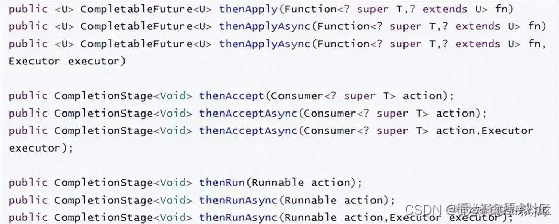 - thenApply 方法:当一个线程依赖另一个线程时,获取上一个任务返回的结果,并返回当前 任务的返回值。