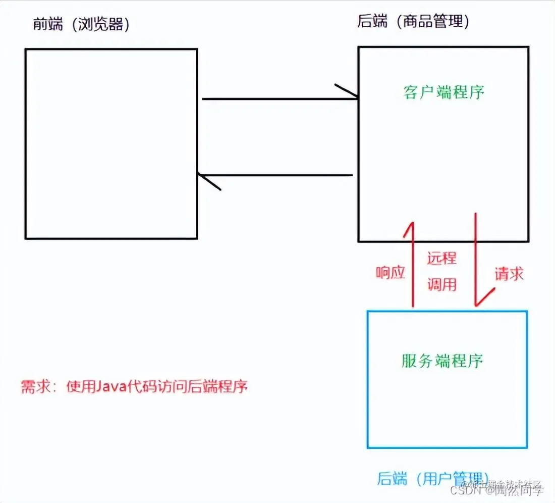 - “商品管理系统”调用“用户管理系统”的过程,就是“远程调用”。此时“商品管理系统”相当于模拟“浏览器”。