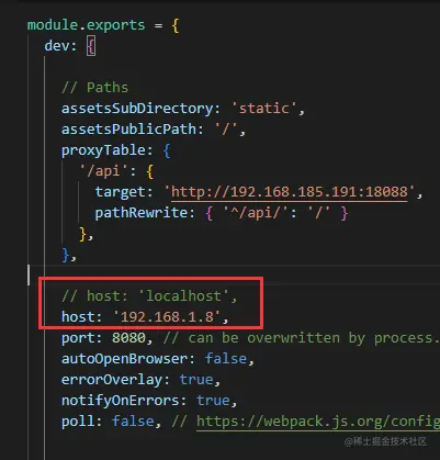 另一种是将host: 'localhost',改成‘0.0.0.0’,这就是任何ip都能访问。只要在url的输入ip就能访问