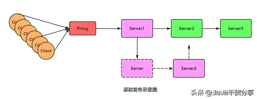 相对于蓝绿发布需要一套完备的机器不同, 滚动发布只需要一台机器(这儿这是为了理解, 实际可能是多台), 我们只需要将部分功能部署在这台机器上, 然后去替换正在运行的机器, 如上图, 将更新后的功能部署在Server1 上, 然后Server1去替换正在运行的Server, 替换下来的物理机又可以继续部署Server2的新版本, 然后去替换正在工作的Server2 , 以此类推, 直到替换完所有的服务器, 至此 ,服务更新完成。