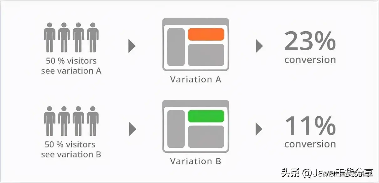 A/B测试时,线上同时运行多个版本的服务,这些服务通常会有一些体验上的差异,譬如说页面样式、颜色、操作流程不同。相关人员通过分析各个版本服务的实际效果,选出效果最好的版本。