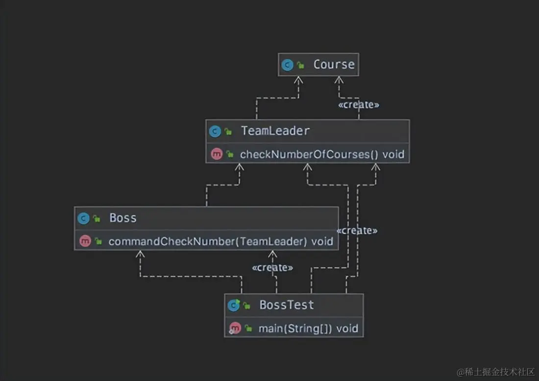 写到这里,其实功能已经都已经实现,代码看上去也没什么问题。根据迪米特原则, Boss 只想要结果,不需要跟 Course 产生直接的交流。而 TeamLeader 统计需要引用 Course 对象。 Boss 和 Course 并不是朋友,从下面的类图就可以看出来: