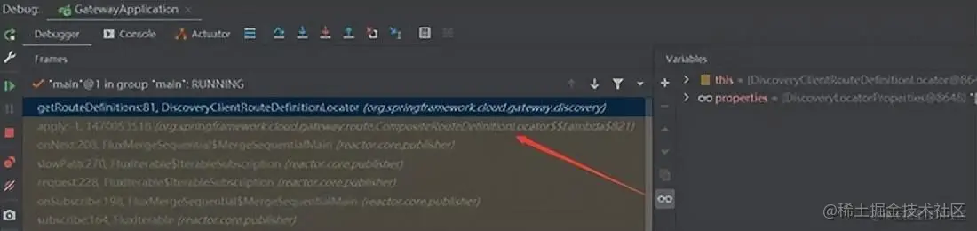 DiscoveryClientRouteDefinitionLocator.getRouteDefinitions() 的具体实现。在这个方法打上断点,发现应用启动会走到这里!
