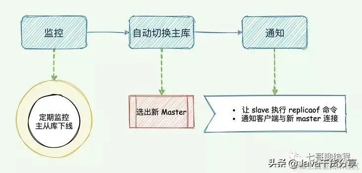 - 自动故障迁移( Automatic failover ) :当检测到主节点宕机后,断开与宕机主节点连接的所有从节点,在从节点中选取一个作为主节点,然后将其他的从节点连接到这个最新主节点的上。并且告知客户端最新的服务器地址。