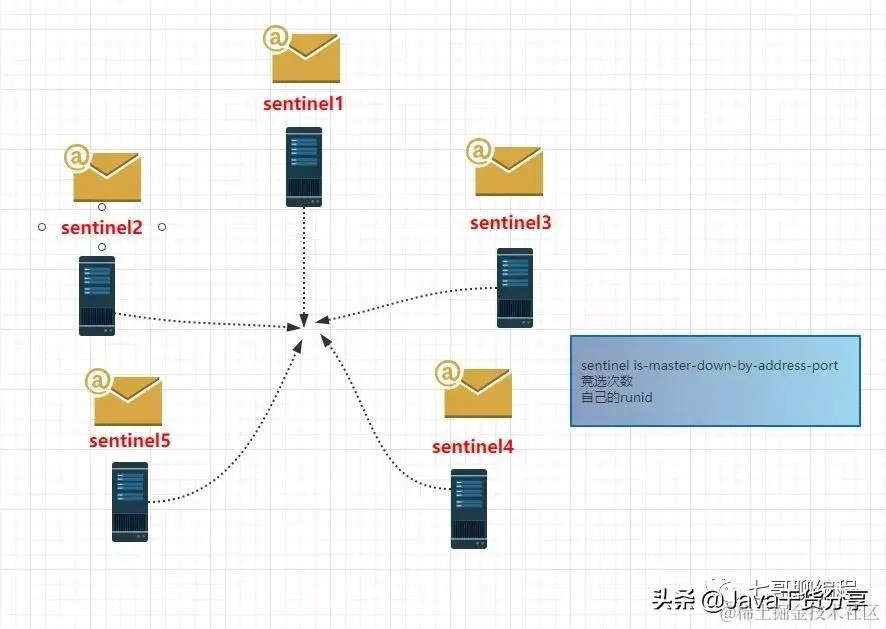这个时候呢!5个sentinel就在一起开会了,所有的哨兵都在一个内网中,然后他们会做一件事情就是五个sentinel会同时发送指令sentinel is-master-down-by-address-port 并且携带上自己竞选次数和runid。