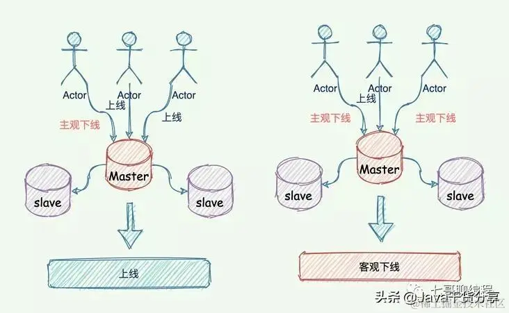 - 对于一个哨兵认为主节点挂了称之为主观下线,超半数哨兵认为主节点挂了称之为客观下线。