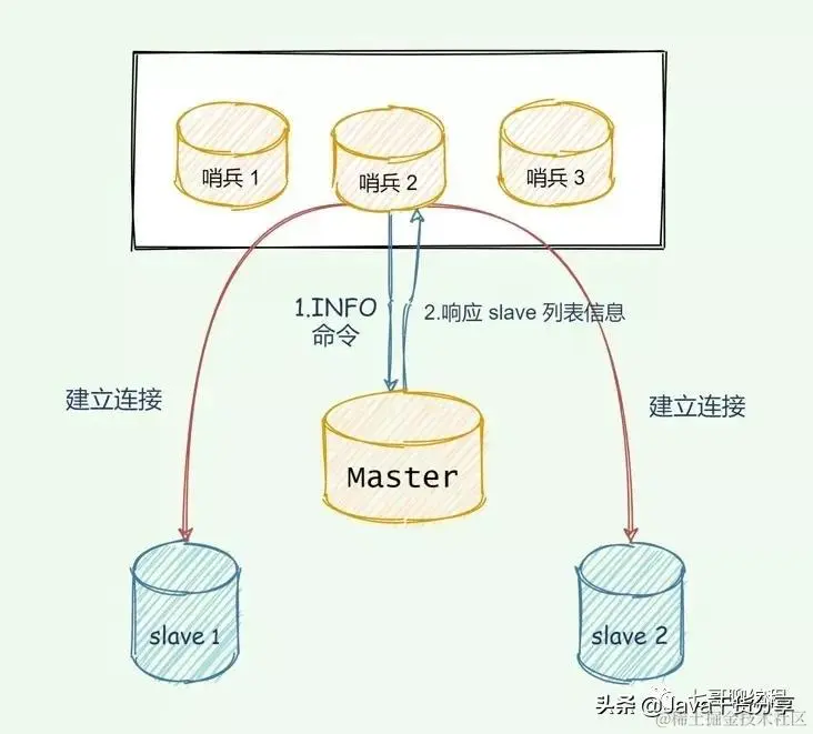 - 哨兵会根据在主节点拿到的从节点信息,给对应的从节点建立连接后发送info指令;