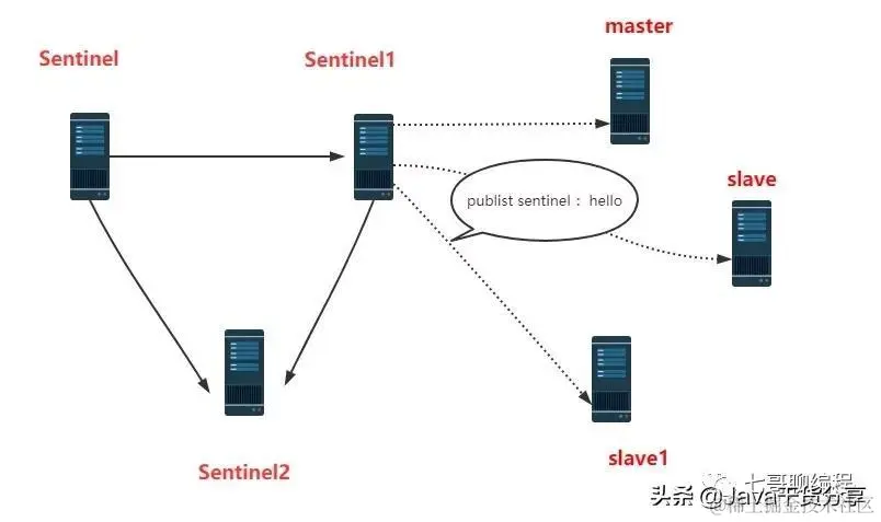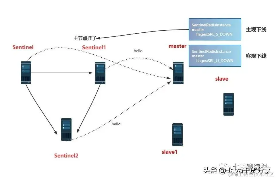 - 哨兵会一直给主节点发送 publish sentinel :hello,直到哨兵收不到响应而报出 sdown。哨兵报出主节点 sdown 后还没有完,哨兵还会往内网里发布消息给其它哨兵说明这个主节点挂了。发送的指令是 sentinel is-master-down-by-address-port。