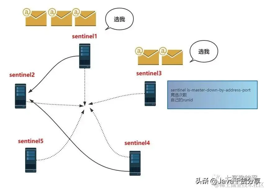 每个 sentinel 既是参选者也是投票者,每个sentinel都有一票,信封就代表自己的投票权。