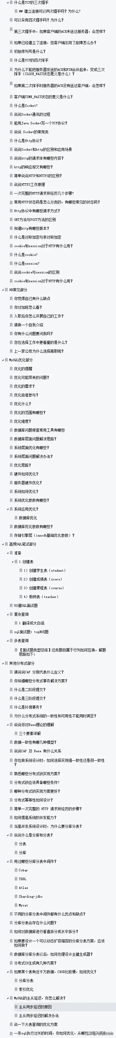 这份笔记分为Java基础、并发编程、JVM、Dubbo、MyBatis、Kafaka、RabbitMQ、Redis、Netty、Spring、Spring boot、Spring Cloud、Zookeeper、计算机网络、HR常问、MySQL优化、高频sql笔试、分布式部分等20个知识点;