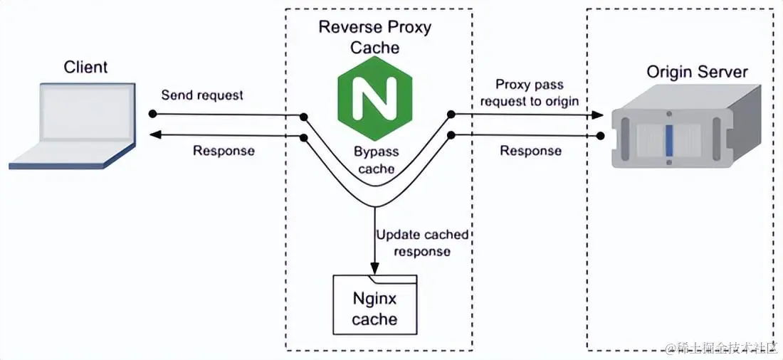 nginx可以实现图片、css、js等静态资源文件的缓存,nginx作为缓存服务器时是搭配nginx作为反向代理服务器一起使用的。当客户端第一次通过nginx向后端资源服务器请求静态资源,响应给对应的客户端同时自身缓存一份,后续如果请求相同的资源,就不需要再次向后端服务器请求了,除非缓存被清理或者缓存过期。
