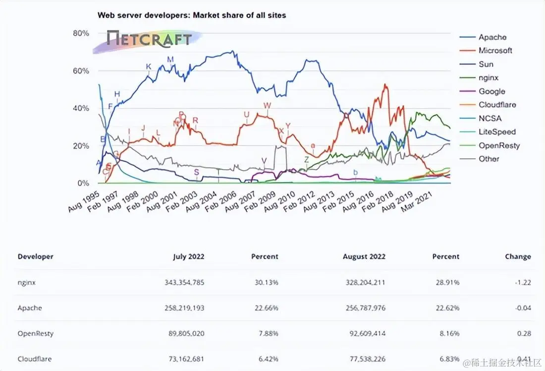 目前主流使用的web服务器软件,主要有apache、nginx、tomcat、iis等,在全球范围内来说,Apache是现有的最流行的Web服务器,但是在高流量网站中最流行的Web服务器确实nginx,在我国不管是大中小互联网公司,主流选择的也是nginx作为web服务器软件。一份来自Netcraft的调查中,发现Apache的使用率为31.54%,Nginx的使用率为26.20%。