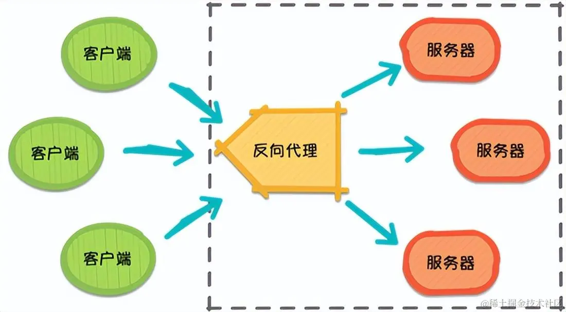 这就是反向代理(Reverse Proxy),反向代理隐藏了服务器的信息,它代理的是服务器端,代其接收请求。换句话说,反向代理的过程中,客户端并不知道具体是哪台服务器处理了自己的请求。如此一来,既提高了访问速度,又为安全性提供了保证。
