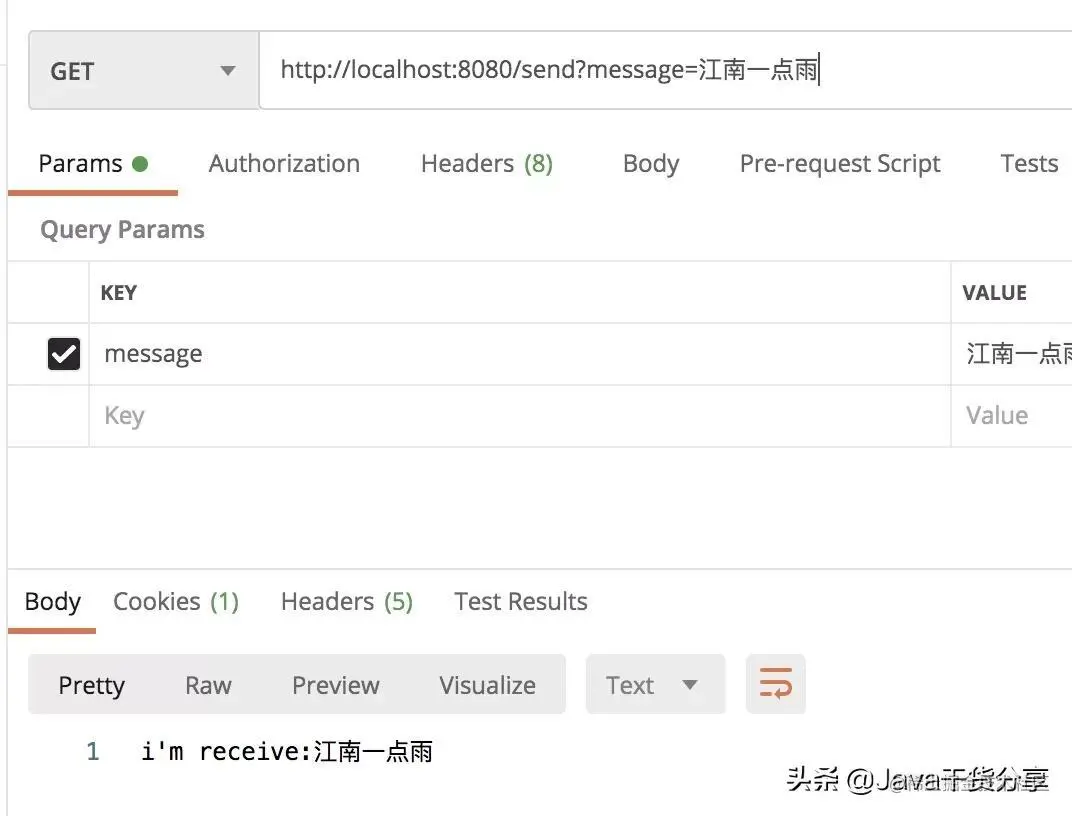 接下来分别启动 producer 和 consumer,然后在 postman 中调用 producer 的接口进行测试,如下: