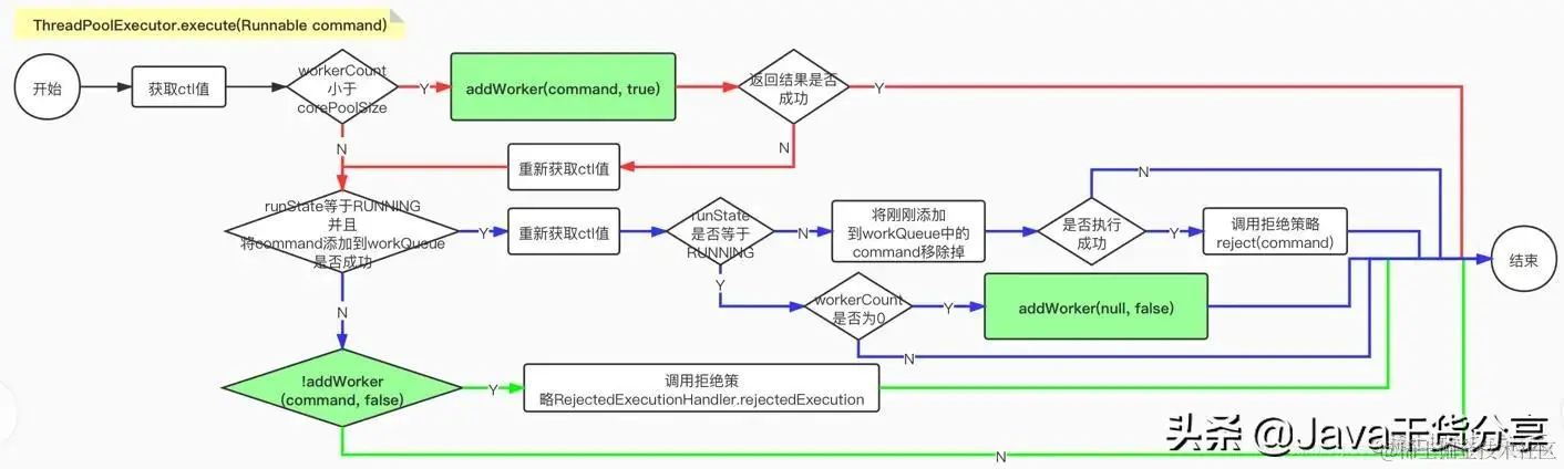 执行方法有两个,分别是 execute() 和 submit(),最主要的区别就是 submit() 方法可以接受线程池执行的返回值,而 execute() 不能接收返回值。