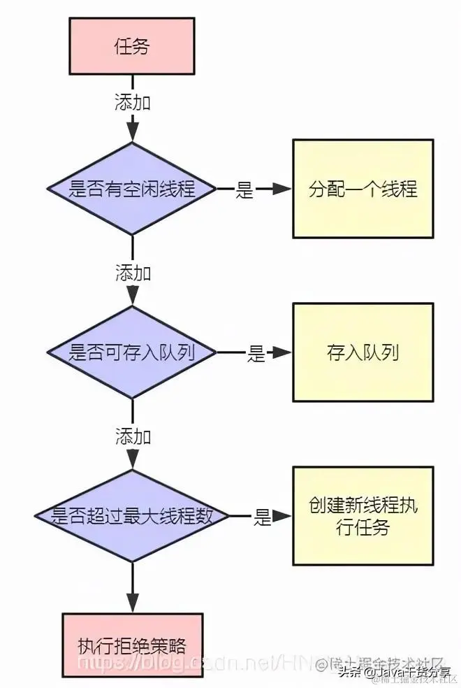 当线程池中的任务队列已满,再有任务来添加时会先判断当前线程池中的线程数是否大于等于线程池的最大值,如果是,则会触发线程池的拒绝策略。