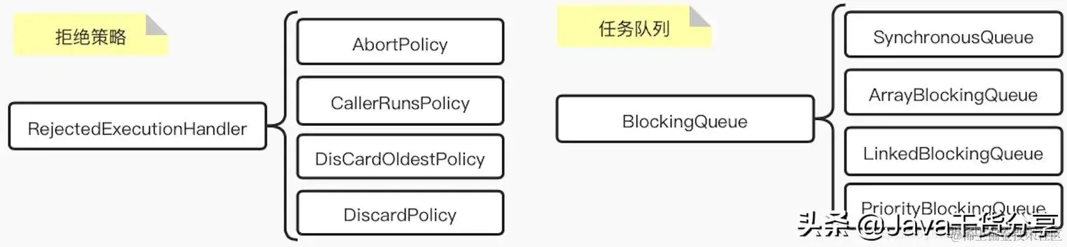 4、如果队列已满,并且当前线程数目也已经达到上限,那么意味着线程池的处理能力已经达到了极限,此时需要拒绝新增加的任务。至于如何拒绝处理新增的任务,取决于线程池的饱和策略RejectedExecutionHandler。