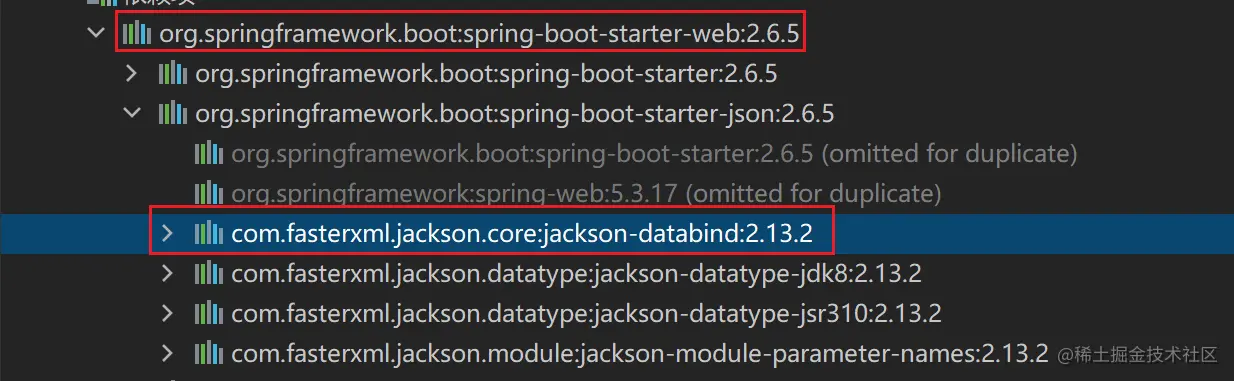 我们使用 SpringBoot进行开发时,当我们引入 spring-boot-starter-web场景启动器后,该场景中就包含了 jackson依赖,不需要再额外导入。