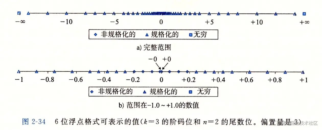 - 表示距离0近的数(非规格化的值越靠近原点越稠密)