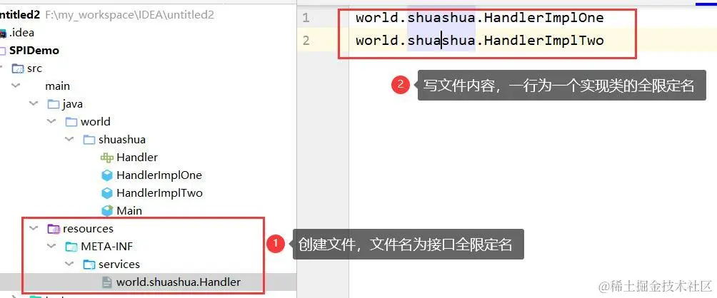 - 接口实现类需要在jar包的META-INF/services目录下创建一个文件,文件名为“接口全限定名”,内容为实现类的全限定名。