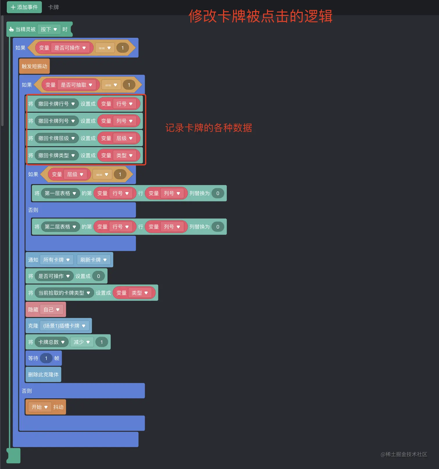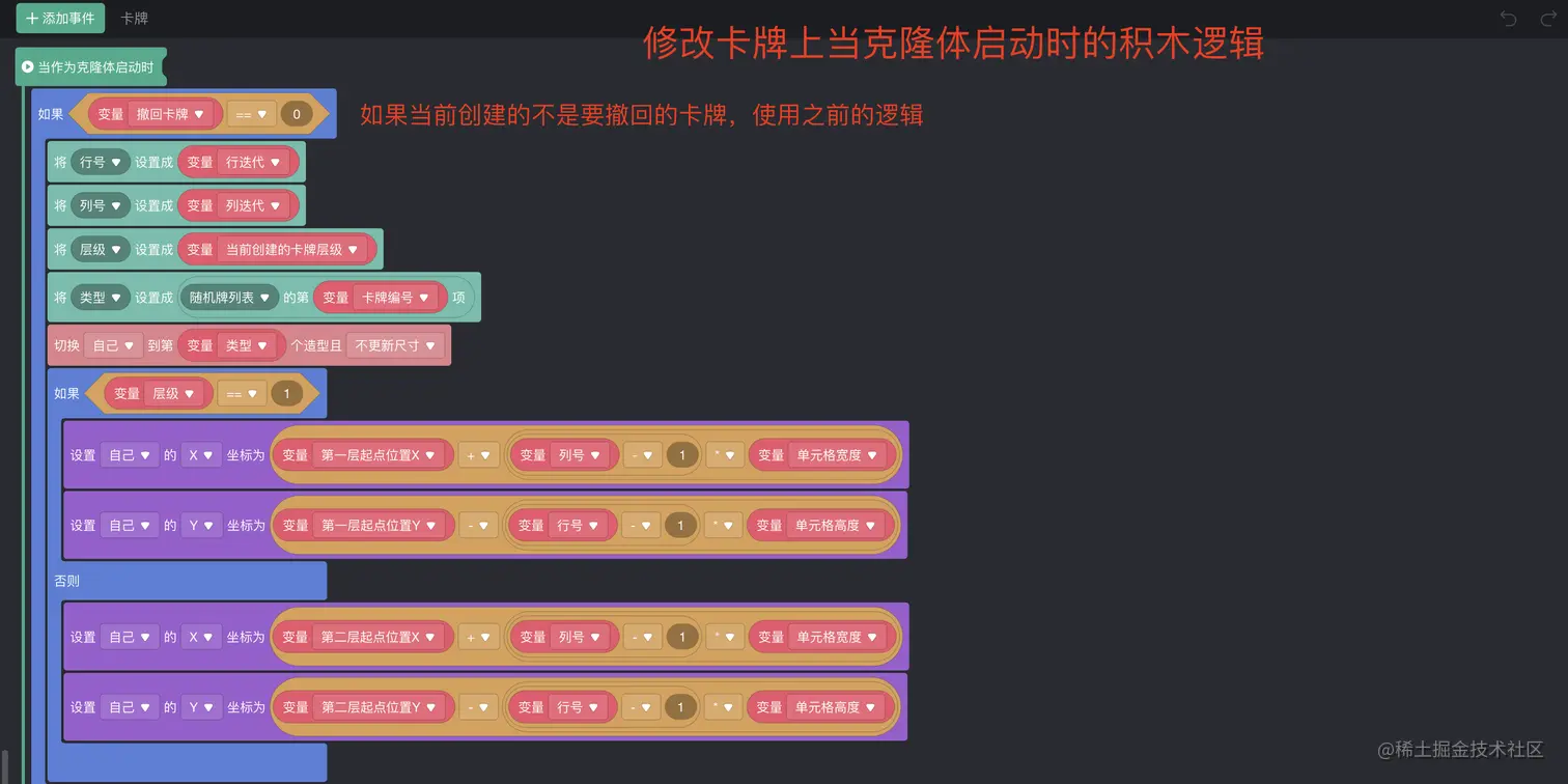 再来看一下“卡牌”上的一些积木逻辑的修改。