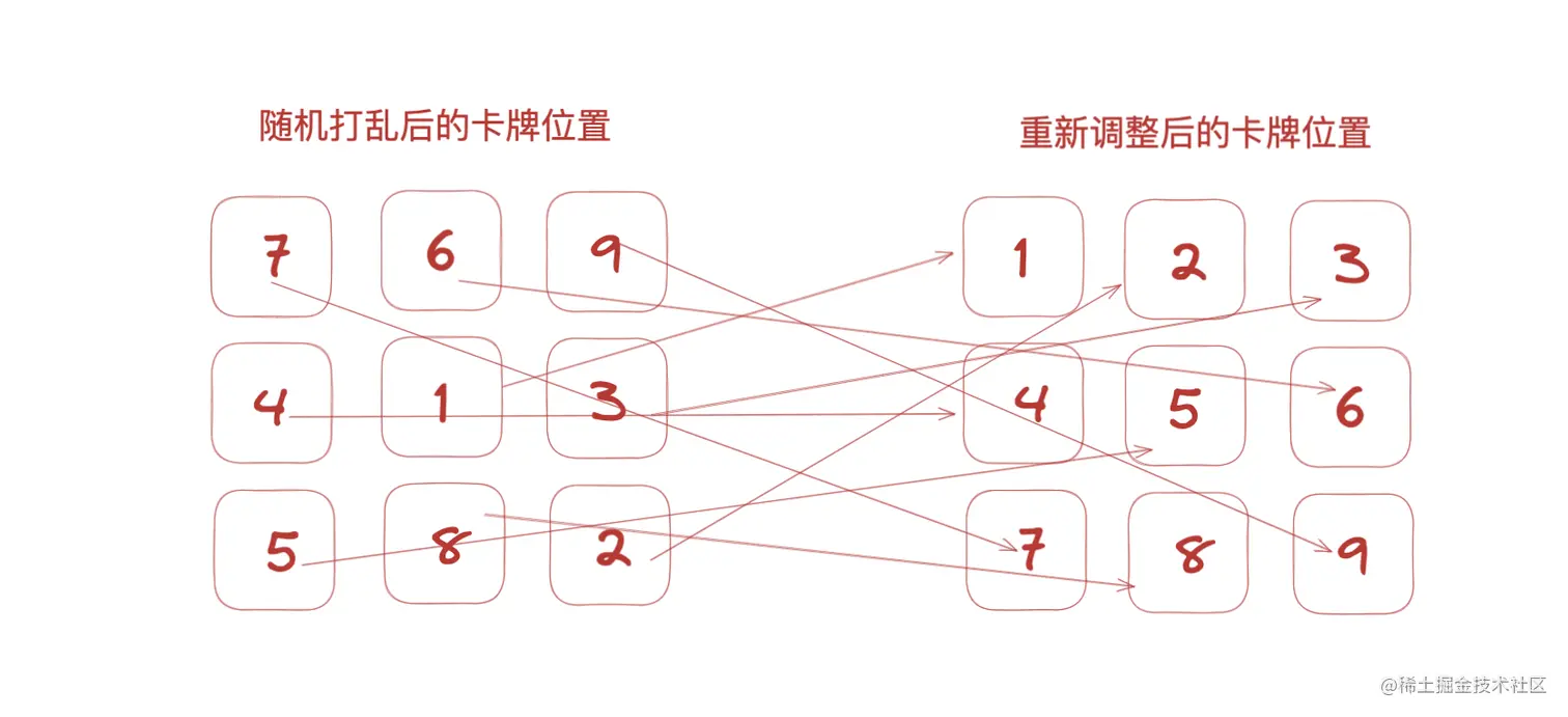 在随机打乱之前,卡牌按照顺序排列,将所有卡牌的位置编号添加到一个列表中,将这个列表进行随机的打乱,就能够得到一个乱序的列表,然后从第一项开始,将新列表的位置依次的设置到卡牌的位置中,得到的就是下方的随机打乱后的卡牌位置,最后再将这些卡牌按照设置的位置重新进行排列。