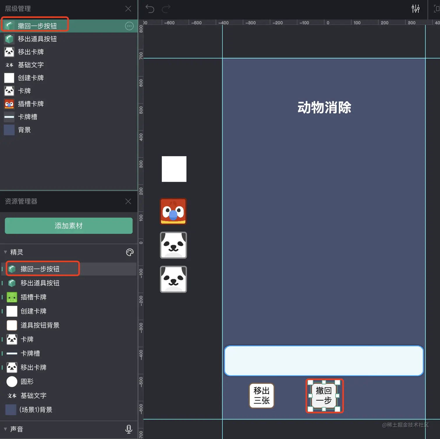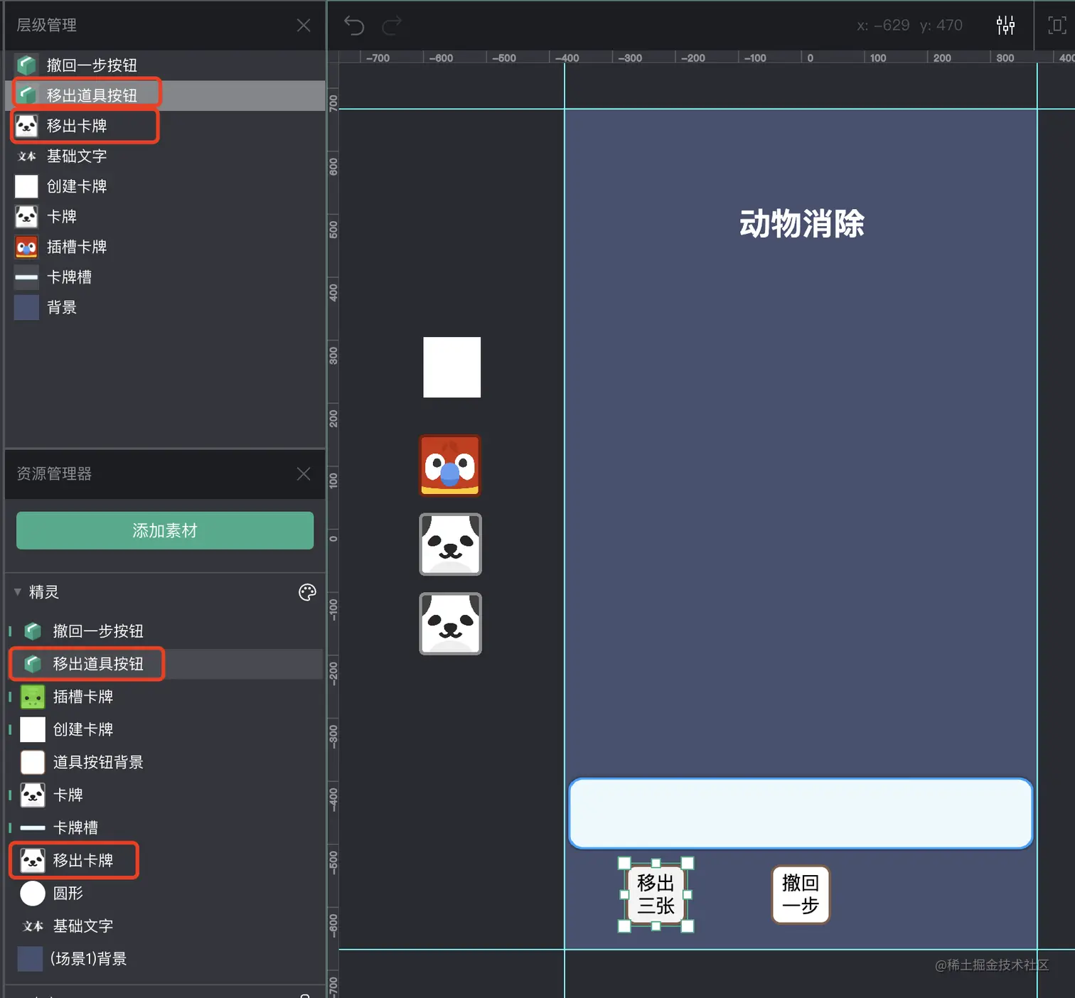 一个是移出道具的按钮(这里我使用了容器来制作按钮),另一个是“移出卡牌”,这里我们单独创建了一个新的“移出卡牌”精灵,它专门负责处理移出卡牌的功能和逻辑。