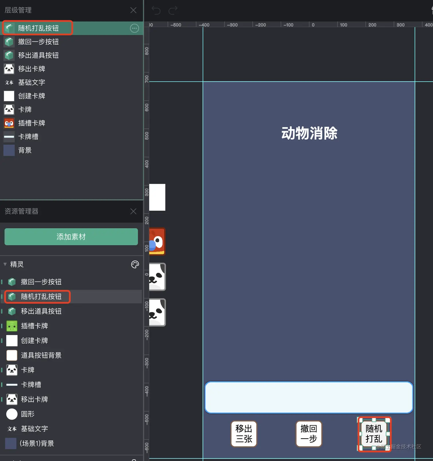 接着,在场景中,新增一个“随机打乱按钮”。
