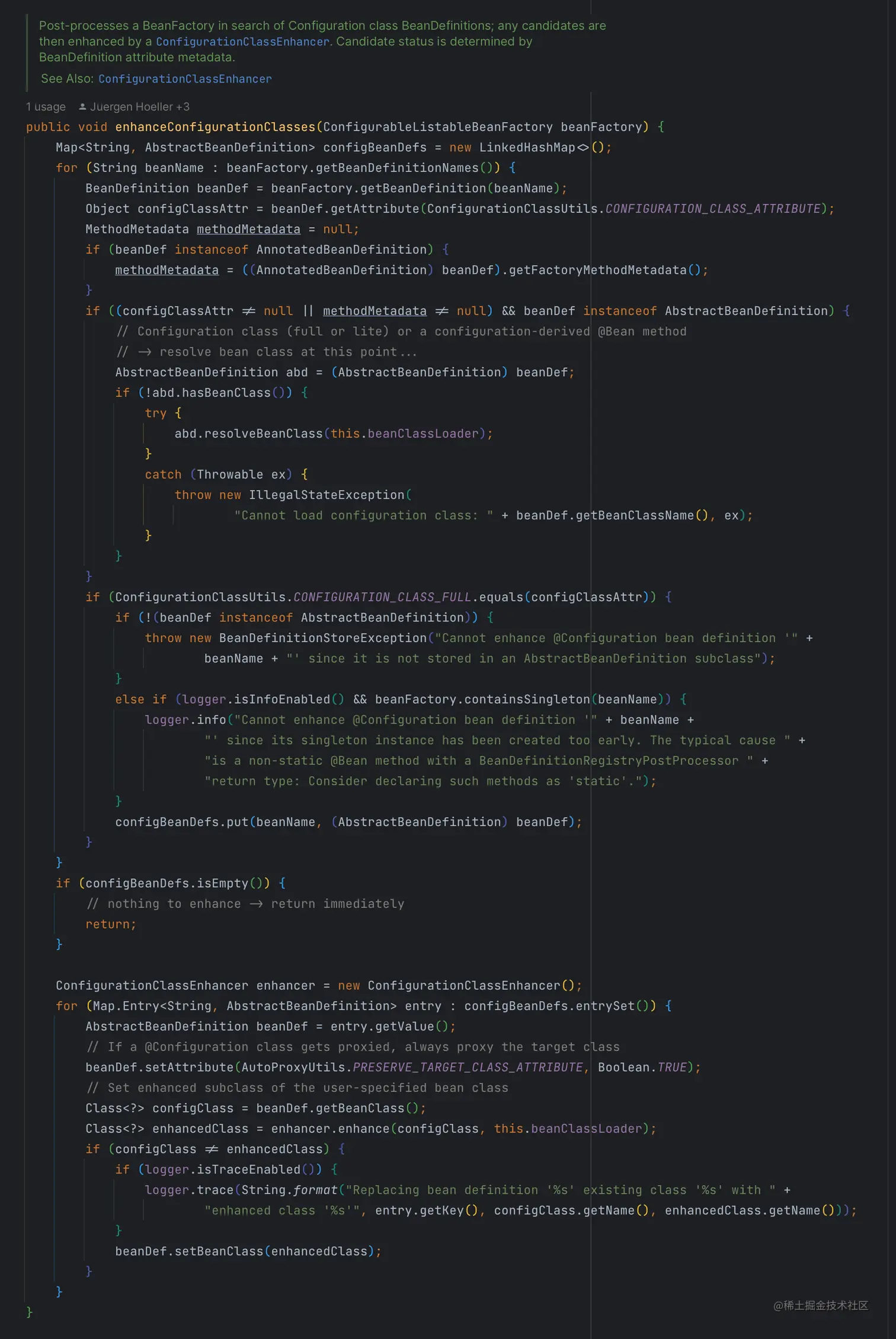 从方法的名称来看,这个方法是对配置类的增强。进入enhanceConfigurationClasses方法的源码。