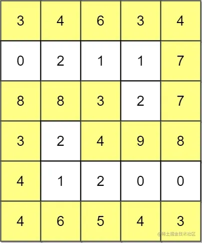 输入: grid = [[3,4,6,3,4],[0,2,1,1,7],[8,8,3,2,7],[3,2,4,9,8],[4,1,2,0,0],[4,6,5,4,3]]