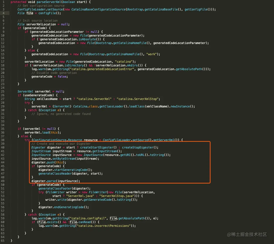 上篇文章我们介绍到,在Catalina的load方法中,完成了server.xml的解析,将server.xml配置的Server、Service、Connector、Engine、Host各组件实例化,并维护父子级关系。本篇文章我们来看一下server.xml是如何解析的。