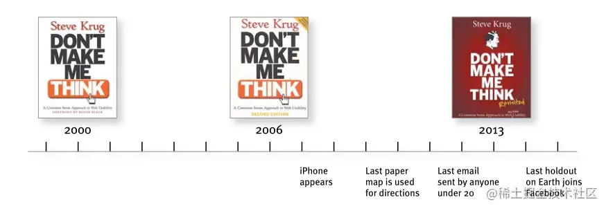 《Don't Make Me Think》 第一版出版于 2000,至今都已经过去 20 年了,随着技术的发展,当时很多例子过时,很多技术也不再使用,然后作者在 2006 年对书进行了升级。